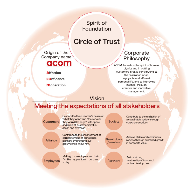 Vision is the long-term embodiment of the "founding spirit," "origin of the company name," and "corporate philosophy," which are the universal values and beliefs of the ACOM Group. Vision structure consists of vision and a set of action guidelines that show specific actions to realize the vision.